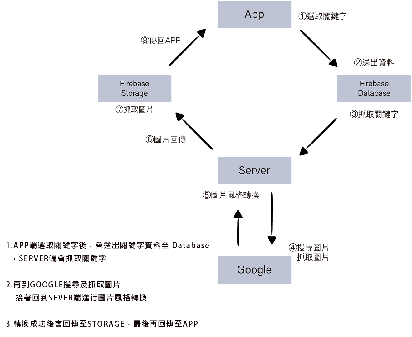 內容圖及風格圖透過卷積濾波器與池化層,多次萃取影像特徵並降低解析度後,再計算損失的誤差值,最後將影像生成即可產出結果圖。